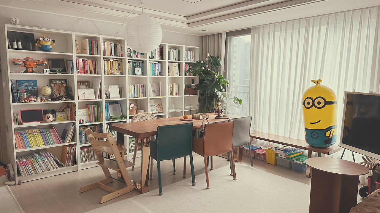 그래서 휴가를 맞이하며 가장 처음으로 한 일이 거실 한 면에 책장을 놓고, 각 방의 주제를 명확히 하는 거였다. 기존엔 책이 거실에 아이 책 가득, 내 서재에 내 책 가득, 아이 방에 놀이용 책이 놓여있었다. 이제 자신이 아기가 아니고 언니라며 으쓱하는 아이는 한글도 조금씩 배우고 있다. 그러면 스스로 책 읽기도 할 거라 그에 대비해서라도 변화가 필요했다. 그래서 모든 책을 거실로 모았다. 거실 한 면은 책장으로 세팅하고 아이 팔이 닿는 곳 까지는 아이 책을, 그 위로는 누구나 읽으면 좋을 내 책들을 넣어두었다.(아직도 서재 곳곳에 책이 남아 있음)