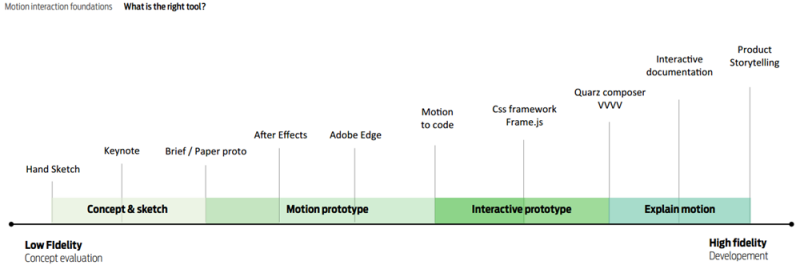 Motion Design을 하는데 fidelity(충실도)에 따라 손 그림부터 실제 제품 기반의 스토리텔링의 다양한 스펙트럼이 존재합니다. 즉, 각각의 스펙트럼 별로 사용되는 도구들이 다르다는 이야기이지요. (발표자료에는 Motion 과 Interaction 의 차이. 월트 디즈니의 12가지 애니메이션 규칙 등이 언급되어 있습니다)