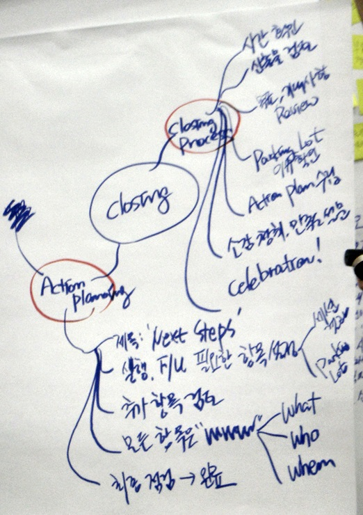 - Group memory를 만들어주기 : 방안에 있는 모든 참석자들이 같은 내용을 가지고 갈 수 있도록 내용을 알려줘야 한다. (적어서 벽에 붙이거나 중간중간 말로 tracking 해주기)