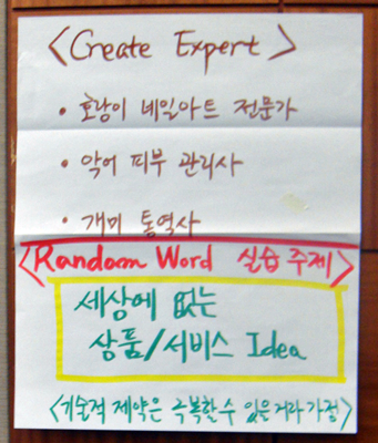 Random word/Random picture : 주제와 관련없는 단어나 그림을 주고 해당 word/pricture의 특성을 brainstorming 한 후 이 특성과 주제를 강제로 연관시키는 방식. 창의적인 아이디어를 만들어내는 데 도움이 됨