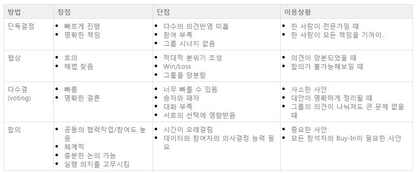 - 다수결로 의사결정을 내리는데 사용되는 방법으로 모든 참석자가 최종 의사결정에 참여하므로 결과에 대한 Commitment가 높다.