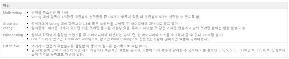 - 자유롭게 의견을 개진할 수 있게 함 (리더의 참여 방법/범위 조절, 무기명으로 의견을 표현하도록 함, 소그룹 토론 진행)