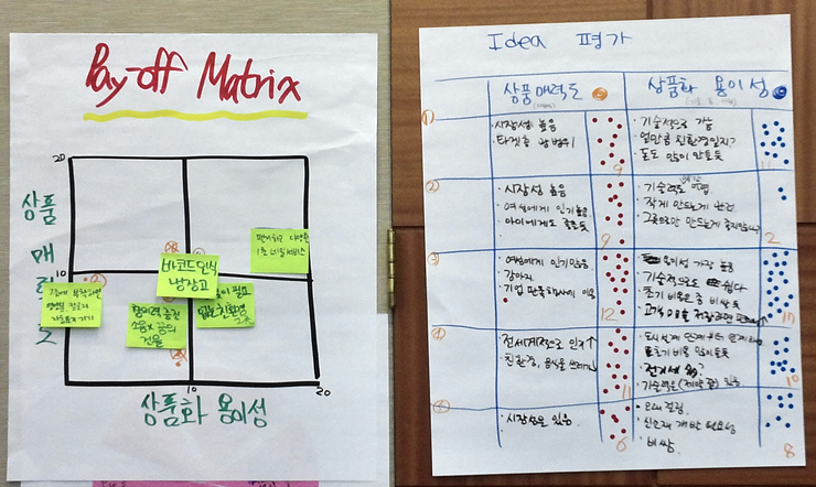 - 나온 아이디어들은 Dot voting을 수행하여 Idea Grouping을 하고, 구체화를 진행함