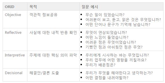 - 개인과 소그룹의 개별 경험에서 통찰력을 찾고, 학습으로 연계하기 위한. 무엇이 일어났었는지 회고하고, 사고하도록하는 Focused Conversation 방식