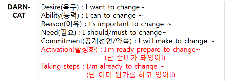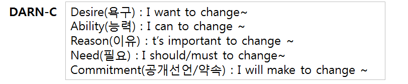 Change talk에서는 DARN-C 를 이끌어낼 수 있도록 대화를 이끌어 나갑니다. 상담자는 이 5가지를 어떻게하면 더 많이 이끌어낼 수 있을지를 생각하며 상담을 진행해야 합니다.