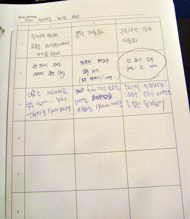 - Brainstorming과 비슷하지만, 말로 하는 것이 아닌 글로 적는 방법
