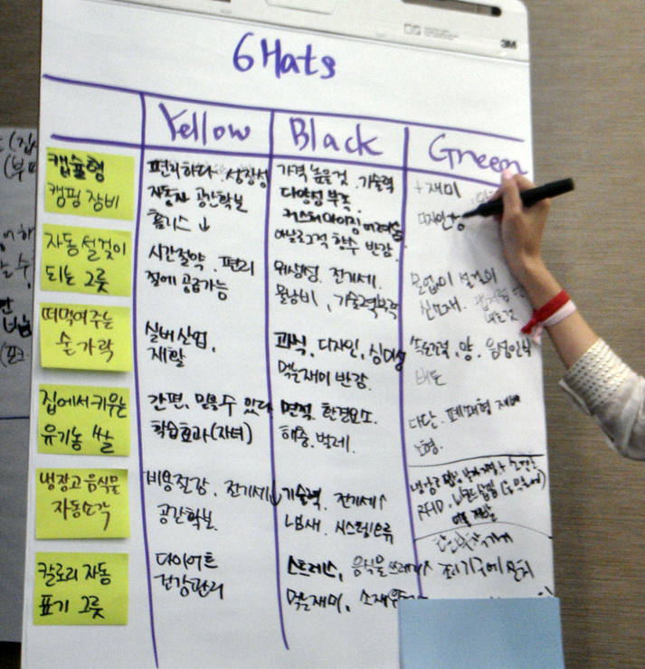 - 녹색 : Creative Thinking. 새로운 아이디어 제시, 약점을 보완할 대안 제시