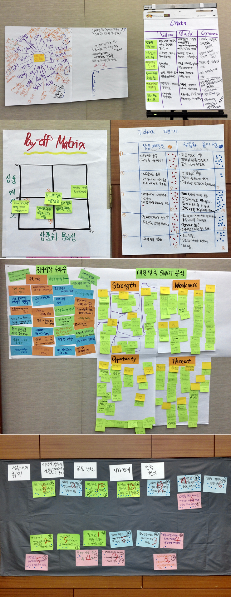 - tip : 부정적 사고 후에는 긍정적인 사고가 힘들다. 따라서 yellow를 먼저 쓰는게 좋을 수 있음. 본인이 낸 아이디어에는 black을 써서 의도적으로 부정적인 면을 볼 수 있도록 하기.