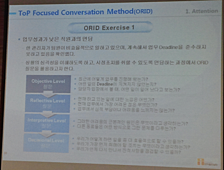 - 개인과 소그룹의 개별 경험에서 통찰력을 찾고, 학습으로 연계하기 위한. 무엇이 일어났었는지 회고하고, 사고하도록하는 Focused Conversation 방식