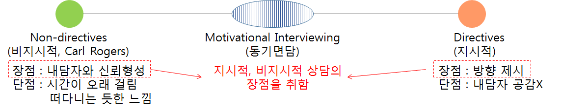 동기면담은 지시적 상담과 내담자 중심 상담의 중간 정도라고 볼 수 있습니다. 지시적, 비지시적 상담의 장점을 취하고 있기 때문에 Guide라고도 불러요.