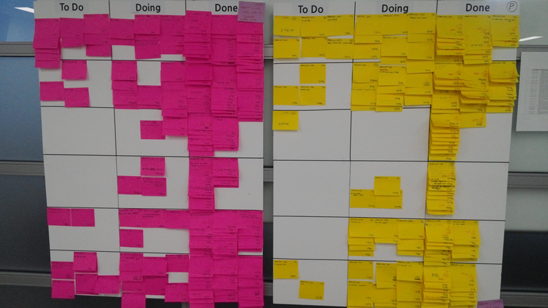JIRA에 다 있는 것들인데 전부 포스트잇에 옮겨 적고, 아침에 30분씩 조직책임자들과 같이 앉아서 어제까지 붙였던 포스트잇에 대해 리뷰를 하고 새로운 업무를 분배합니다. 그리고 저는 다시 오늘 발생한 이슈들을 구분해서 각각 다른 색상의 포스트잇에 옮겨 적어 오프라인 보드에 붙이는거죠.